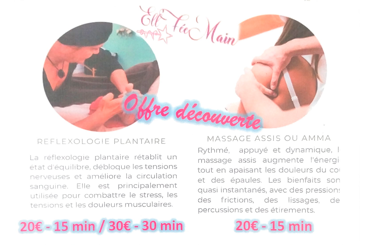 • Massages assis : 20€ – 15min